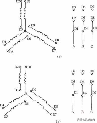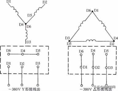 本期专栏为大家分享《实用的接线方法》,希望对大家工作和生活有所帮助。1.电动机接线一般常用三相交流电动机接线架上都引出6个接线柱,当电动机铭牌上标为Y形接法时,D6、D4、D5相连接,D1~D3接电源;为△形接法时,D6与D1连接,D4与D2连接,D5与D3连接,然后D1~D3接电源。可参见图1所示连接方法连接。