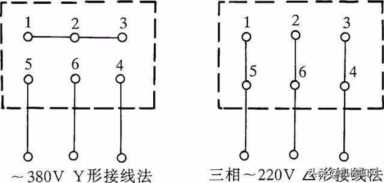 图1 三相交流电动机Y形和△形接线方法2.三相吹风机接线有部分三相吹风机有6个接线端子,接线方法如图2所示。采用△形接法应接入220V三相交流电源,采用Y形接法应接入380V三相交流电源。一般3英寸、3.5英寸、4英寸、4.5英寸的型号按此法接。其他吹风机应按其铭牌上所标的接法连接。