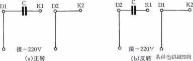 图4是JX07A-4型单相电容运转电动机接线方法。电动机功率为60W,用220V/50Hz交流电源、电流为0.5A。它的转速为每分钟1400转。电容选用耐压400~500V、容量8μF的产品。图4(a)为正转接线,图4(b)为反转接线。5.单相吹风机接线