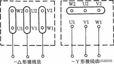 有的单相吹风机引出4个接线端子,接线方法如图5所示。采用并联接法应接入110V交流电源,采用串联接法应接入220V交流电源。6.Y100LY系列电动机接线目前,Y系列电动机被广泛应用。Y系列电动机具有体积小、外形美观、节电等优点。它的接线方式有两种:一种为△形,它的接线端子W2与U1相连,U2与V1相连,V2与W1相连,然后接电源;另一种为Y形,接线端子W2、U2、V2相连接,其余3个接线端子U1、V1、W1接电源。接线见图6。