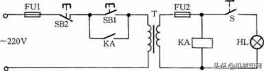 工作原理:闭合S后,按下按钮SB1,变压器得电输出36V低电压,使得继电器或交流接触器KA吸合。放松按钮SB1后,KA自锁触点使KA保持吸合,继续给变压器接通电源。如果变压器次级发生短路故障,继电器线圈电压为零,此时KA便失电释放,将变压器电源断开,保护变压器不被破坏。