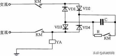 快速退磁的工作原理是:直流电磁铁断电后,交流电源通过桥式整流器和YA向电容C充电,随着电容C两端电压的不断升高,充电电流越来越小,而通过YA的电流又是交变的,从而使电磁铁快速退磁。电容C的容量要根据电磁铁的实际情况现场试验决定。R为放电电阻。