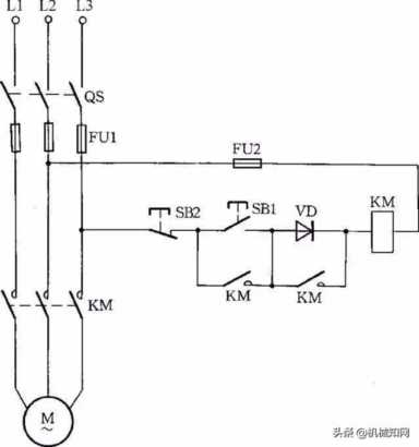 为防止误操作电气设备,并防止非操作人员启动某些设备开关按钮,可采用加密的电动机控制线路,如图13所示。操作时,首先按下SB1按钮,确认无误后,再同时按下加密按钮SB3,这样控制回路才能接通,KM线圈才能吸合,电动机M才能转动起来。而非操作人员不知其中加密按钮(加密按钮装在隐蔽处),故不能操作此设备开关。14.交流接触器低电压启动线路当供电电压在交流接触器吸引线圈额定电压的85%以下时,启动接触器衔铁将跳动不止,不能可靠吸合,在交流接触器的控制回路中串联一只整流管,改为直流启动交流运行,就可以避免上述问题。交流接触器低电压启动线路如图14所示。按下按钮SB1,经二极管VD半波整流的直流电压加在交流接触器KM线圈上,KM吸合。其辅助触点将二极管VD短接,交流接触器投入交流运行。