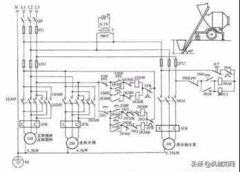 17.混凝土搅拌机线路锥型JZ350型搅拌机线路如图17所示,工作原理是当把水泥、砂子、石子配好料后,操作人员按下按钮2SBF后,2KMF接触器线圈得电吸合,使上料卷扬电动机2M正转,料斗送料起升。当升到一定高度后,料斗挡铁碰撞行程开关1SQ和2SQ,使2KMF断电释放。这时料斗已升到预定位置,把料自动倒到搅拌机内,并自动停止上升。此时操作人员按下下降按钮2SBR时,卷扬系统带动料斗下降,待下降到其料口与地面平齐时,挡铁碰撞行程开关3SQ,使2KMR接触器断电释放,自动停止下降,为下次上料做好准备,这时搅拌机料已备好,操作人员再按下3SB1,3KM接触器得电吸合,使供水抽水泵电动机3M运转,向搅拌机内供水,与此同时,时间继电器KT得电工作,待供水与原料成比例后(供水时间由KT时间继电器调整确定,根据原料与水的配比确定),KT动作延时结束,从而使3KM自动释放,供水停止。加水完毕即可实施搅拌。按下1SBF正转按钮,1KMF得电吸合,1M正转搅拌,搅拌完毕后按下1SB停止按钮即可停止。出料时,按下1SBR按钮,1M反转即可把混凝土泥浆自动搅拌出来。然后按下1SB,接触器1KMR断电释放,1M停转,出料停止。