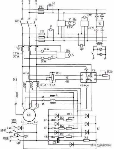 HF-4-81系列发电机控制线路如图15所示,它与T2XV系列小型三相同步发电机配套。同步发电机的励磁系统采用电复合相复励调压。发电机端电压经线性电抗器L移相,然后与发电机负荷电路中的电流互感器5TA~7TA二次电压合成,经三相桥式整流器整流后,供发电机GS励磁自动调压。16.单相电容电动机线路单相电容电动机启动转矩大,启动电流小,功率因数高,广泛应用于家用电器中,如电风扇、洗衣机。为了便于维修安装,现介绍这种电动机常用的接线方法。