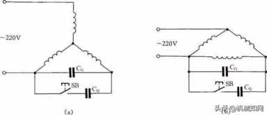如图19所示:图(a)为Y形接法电动机连接方法,图(b)为△形接法电动机连接方法。为了提高启动转矩,将启动电容CQ在启动时接入线路中,在启动完毕后退出。