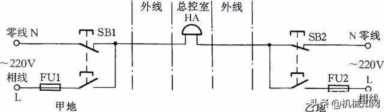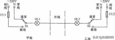 在某些生产过程中,需要两地的生产人员能传递简单的信息,以协调工作。图22所示是用一根导线传递联络信号线路。两地中各有一只双掷开关控制信号灯联络,信号灯分别装在两地,一地一个。当甲地向乙地发联络信号时,拨动开关S1,乙地的指示灯亮,待乙地完成甲地所指示的任务后,乙地可把开关拨至“联络”位置,通知甲地工作已完成。23.用单线向控制室发信号线路图23所示线路可使甲乙两地都能向总控制室发联络信号。当甲地向总控制室发信号时,按下按钮SB1,控制室的电铃告警。同理当乙地向总控制室发信号时按下SB2即可。甲乙两地信号可用信号铃声的时间长短或次数区分。