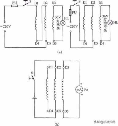 用交流电源和灯泡确定电动机三相绕组的方法是:首先用36V低压灯做试灯,分出电动机每一相线圈的两个线端,然后将两相线圈串接后通入220V电源,剩下的一相线圈两端接36V的灯泡线路通入电源后,灯泡发亮,说明所串联的两相是头尾相接;灯泡不亮,说明是头头相接,如图26(a)所示。然后将测出的两相线圈头尾做一标记,再按此方法将其中一相与原来接灯泡的一相线圈串联,另一相连接灯泡,再按同样道理判断,电动机三相绕组的头尾就很容易区分出来了。