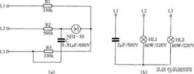 第二种方法是:用一只2μF、耐压为500V的电容和两只相同功率(220V/60W)的白炽灯泡,便可做成一个交流电源相序指示器,见图25(b)。