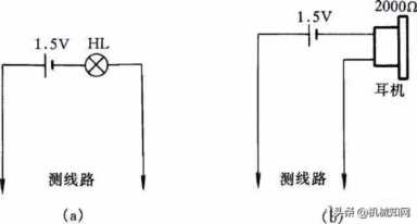 另一种方法是用万用表测定电动机三相绕组头尾,首先用万用表测量出电动机6个接线端哪两个线端为同一相,然后将万用表的直流毫安挡拨到最小一挡,并将表笔接到三相绕组的某一组两端,而电池正负极接到另一相的两个线端上。如图26(b)所示,当开关S闭合瞬间,如表针摆向大于零,则说明电池负极所接的线端与万用表正极表笔所接的线端是同极性的(均可认为是头)。依此类推,便可测出另外两相的头和尾。27.用耳机、灯泡组成简易测线通断器图27(a)、(b)是最简便的线路通断检测器。当测得导线通路时,灯泡会发光,耳机在通断瞬时会发响;当线路断路时,耳机不响,灯泡不亮。这种方法简单易行,非常适合初学电工制作工具仪表或代替万用表做测量,其优点是携带方便。