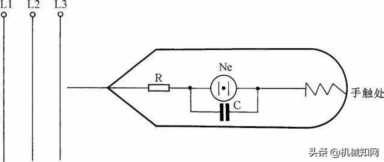 36.自制一种能消除感应电的验电笔在测验三相交流电时,如果带电的线路较长,即使三相交流电缺一相电源,用一般的验电笔测试也很难判断出是哪根电线缺相(因为线路较长,并行的线与线之间产生的电容容量增大,使不带电的某一根电线产生感应电)。为了快速、准确地判断,可在一般的低压验电笔的氖泡上并联一只1500pF小电容,这样在测强电时,电笔照常发光。而测得的是感应电时,感应电会通过电容再经过人体被大地吸收掉,所以电笔不发光。在自制这种验电笔时应把电笔上串联的保护电阻放在测电笔线路的最前端以保障安全,见图36。