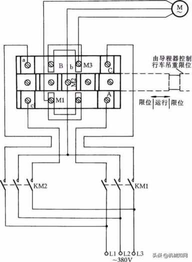 38.一种限位器接线方法车间安装的行车、吊葫芦的起重电动机上,往往需安装保护限位装置,在电动机通电后,避免人为操作失误或接触器触点粘连或铁芯极面脏而不释放造成超上限或超下限工作。因此,限位器在工厂和企业应用极为广泛。这里介绍一种常用限位器接线方法,这种限位器主要用于行车的上下电动机限位。当吊钩高于限制位置时,它会使电动机自动断开电源。这种方法一般是断开主电机电源线,而不是用控制线控制接触器通断电动机停止限位,其优点是万一接触器触点熔在一起不能断开时,限位器同样能起到保护限位的作用。其接线方法如图38所示。