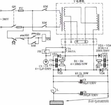 电路中VD1 ~ VD4 为4 只硅整流二极管;R1 ~ R4、C1 ~ C4组成硅整流器件的过压保护电路;FR 为过流继电器,保护硅整流器件。当负载电流超过额定值时,电流互感器次级电流相应增加,带动继电器FR 动作,FR 常闭触点打开,接触器KM 释放,触点打开切断电焊机电源。硅整流器件用0. 25kW 风扇作风冷设备。图中,C5 为滤波电容,R5 为泄放电阻。