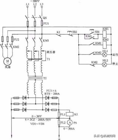 在电镀过程中,常常利用硅整流器件的调压电路进行工作,其工作原理如图41所示。当需进行工作时,按下按钮SB1,接触器KM1 线圈通电,主回路中触点闭合,线路输出直流电压。与此同时,KM2 也得电动作,接通电扇,对硅整流器件以及调压器吹冷风降温。线路中KI 为过流继电器。