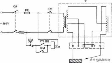 39.交流电焊机一般接法交流电焊机一般接法如图39所示。当合上刀闸QS时,按下按钮SB1,接触器KM得电吸合;松开按钮SB1时,KM自锁触点自锁,电焊机继续得电工作。当按下SB2时,电焊机停止工作。