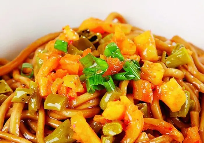 腌制的豆角在牙齿的咀嚼间溅出酸酸的汁液,萝卜丁软软的,清甜可口,混合着酸豆角,唤醒倦怠的味蕾。花生米又焦又香,外皮轻轻一碰就脱落了,虽说不似吃肉,你也能尝到脂肪的醇香。面很有嚼劲,每一根都裹着浓郁香甜的芝麻酱和红灿灿的辣油,每一口都是人间值得,无论吃多少我都不腻。