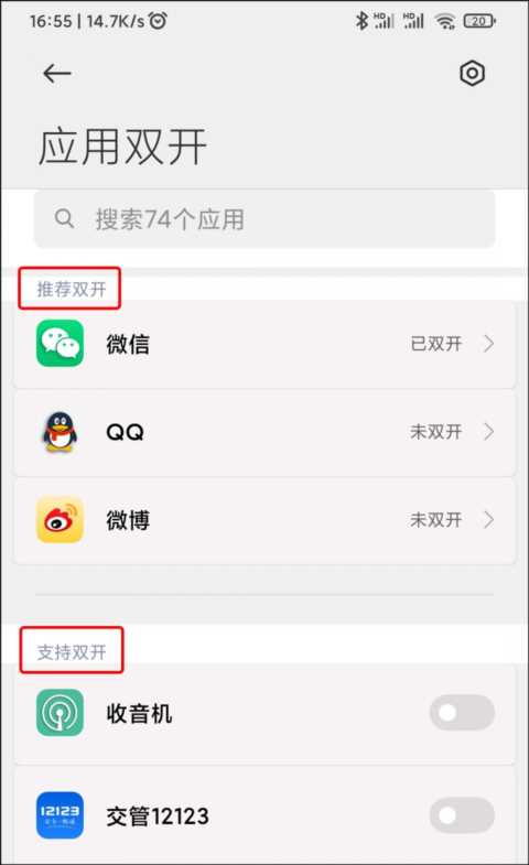 在“应用双开”的界面将手机中安装的应用软件分为两大类,分别是“推荐双开”和“支持双开”。其中,“推荐双开”中包含了微信、QQ和微博3种主流的社交应用,而“支持双开”则显示了手机中安装的大多数应用程序。