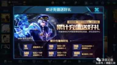 腾讯不定期的优惠活动,充值要等这时候。不推荐大家买抽奖箱子,反正我是什么都没有抽到过。但是!有一个钻石月卡、钻石周卡,如果打折,非常建议买一个。只要充值就可以成为王者荣耀VIP,充值越多,**越高,就可以获得更高的额外奖励,详情可以看看铭文篇和金币篇内容。