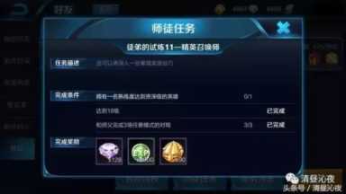 6、师徒任务,和徒弟完成任务即可。师徒任务,可以说是王者荣耀唯一一种速刷铭文碎片的方法,当然也可以用来刷钻石,只需要和徒弟完成任意模式下对战即可获得碎片奖励。但这种方法的难度在于和徒弟或师傅一起刷,推荐刷人机。名师**越高,获取的奖励就越好。注意哦,当师傅,刷铭文,当徒弟,刷钻石。只有徒弟任务,有钻石。