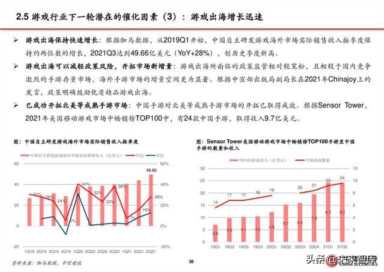 游戏出海可以减轻政策风险,开拓市场新增量:游戏出海所面临的政策监管相对较宽松,且相较于国内竞争 激烈的手游存量市场,海外手游市场的增量空间更为显著。根据中宣部出版局副局长在2021年Chinajoy上的 发言,政策明确鼓励优质精品游戏出海。