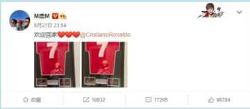 曼联拥趸鹿晗也在深夜发微博欢迎C罗回家,在短短1小时内点赞数已经接近10万,转发量已经接近1.9万,评论量超过1.7万。