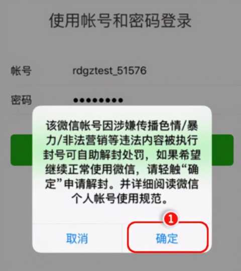1、支持自助解封的微信号,打开微信后,输入微信用户名和密码进行登录,会提示该号被封,点击“确认”进入下一步。