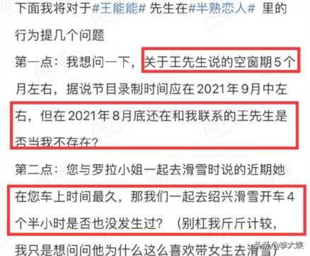通过爆料看,《半熟恋人》是在去年9月开始录制的,但王能能在同年8月还和该女子一起滑雪,并且保持着很暧昧的关系。而看过节目的观众应该还记得,王能能在节目中明确表示过自己有着8个月的空窗期,如果该女子说的是真的,那么王能能在这个问题上就存在说谎的可能,而且节目起码要提前一个多月招募,也就是说王能能是在有暧昧对象的情况下,报名参加恋综的。