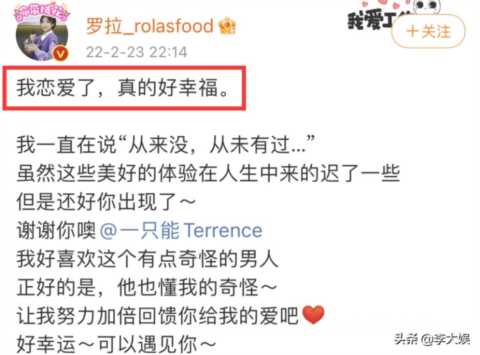 而在甜度爆表的双人直播后,罗拉和王能能还分别发文高调官宣,罗拉表示王能能的出现是一种美好,让她体会了从未有过的幸福,言辞间尽显热恋小女生的雀跃。相比较之下,王能能的发文则更加正式,完整讲述了他对罗拉的心路历程,让人切身体会到了他对这段感情的责任心。