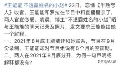 就在大家为“巴啦啦能量”欢呼,吵着要给他们随份子钱时,一位网名为“不透露姓名的小赵”的女性发长文声讨王能能,理出了自己和王能能暧昧的时间线以及一起去滑雪并住一间房的证据,希望男方能给自己一个说法。