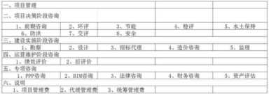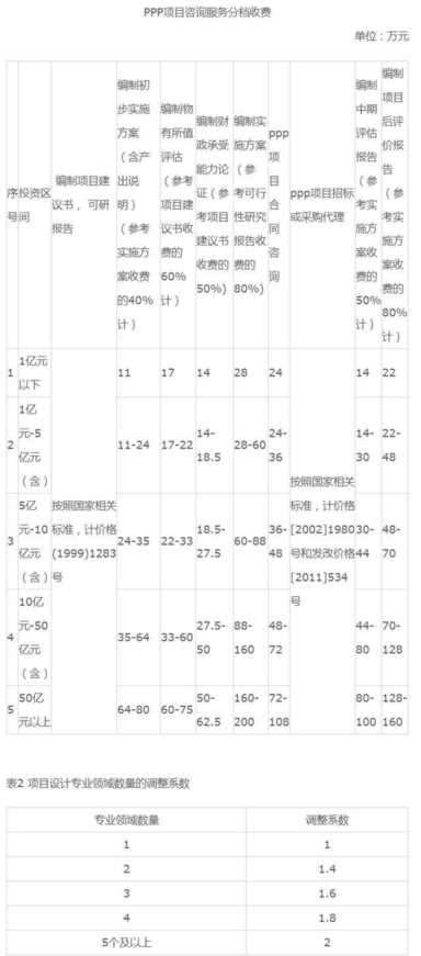 PPP项目主要咨询服务内容包括:项目建议书、可行性研究报告,初步实施方案、物有所值评价报告、财政承受能力论证报告、实施方案,PPP项目合同咨询、项目招标采购代理、中期评估、建设期或运营期绩效考核细化服务方案,建议参照项目投资规模进行收费,具体如下: