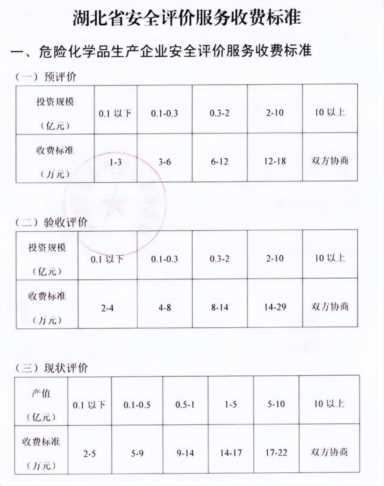 安全评价可参考地方收费标准,如湖北省地方收费标准——《省物价局 省安全生产监督管理局关于安全评价服务收费有关问题的通知》(鄂价工服〔2016〕56号),具体如下: