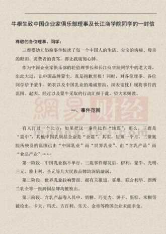 危机之下,他写了封“中国乳业的罪罚治救——致中国企业家俱乐部理事及长江商学院同学的一封信”,向曾经的校友求救。