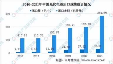 数据显示,我国光伏电池出口量由2016年7.72亿个增至2021年32.01亿个。出口金额由2016年113.18亿美元增至2021年284.59亿美元。