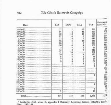 美第十军人事部门在长津湖特别报告中给出了第十军1950年11月27日至12月10日期间的详细伤亡情况,表中称,第十军共阵亡705人,负伤3251人,失踪4779人,共减员8735人,其中海军陆战队1师在此期间在393人阵亡,2152人负伤,76人失踪,共减员2621人。美步3师阵亡50人,负伤206人,失踪147人,共减员403人。美步7师阵亡70人,负伤185人,失踪2505人,共减员2760人,配属给该部的韩军阵亡1人,负伤41人,失踪1560人,共减员1602人。韩军首都师阵亡126人,负伤318人,失踪334人,共减员778人。