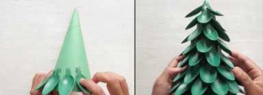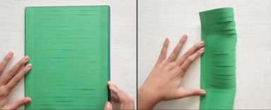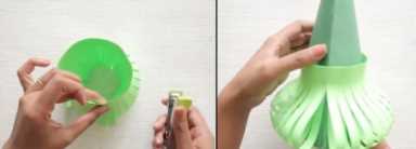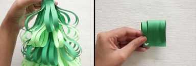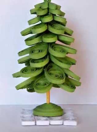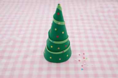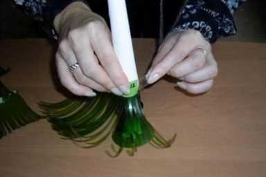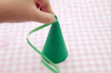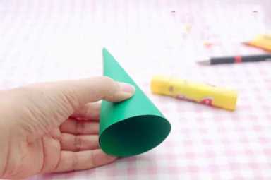 第5步:把浅绿色卡纸剪出一长条,一端粘到圆锥顶端,然后往下绕。