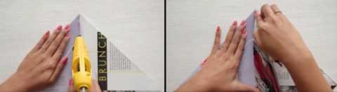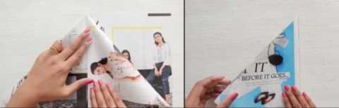 第三步:将剪好的纸张展开,然后把长条分别单独向内翻,固定在中间线上,待全部粘贴好之后,再将底部的尖角向上折出一个小三角,固定。