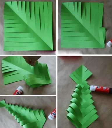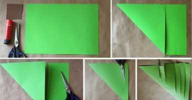 第二步:将绿色彩绘折一个三角形,如图,并将多余的纸张剪掉,按阶梯走向剪长条,注意不要剪断。