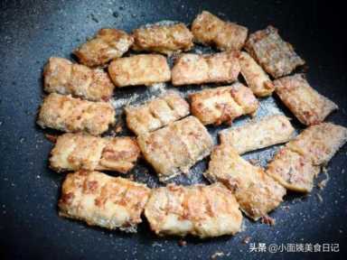 4、锅加入适量油,油温6成热放入带鱼段,先不要翻动,底部定型后翻身,改中小火煎至两面金黄后盛出。