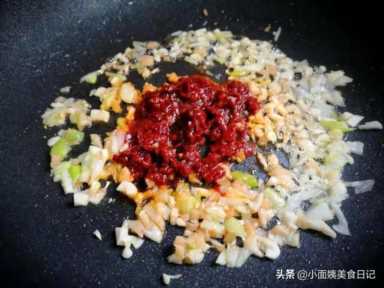 5、锅中再加少许油,提前准备些葱花和姜末,蒜末炒香,加入1勺豆瓣酱炒出红油。