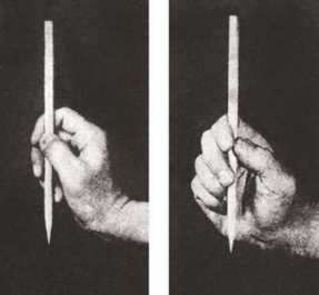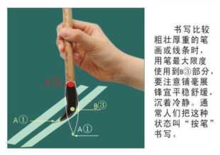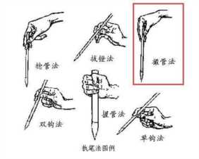 再如握管法,用手掌将笔杆整把地抓住书写。