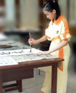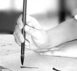 还有执笔的松紧问题。执得太紧,手太用劲就会颤抖且手指疼痛。执得太松,一点力也不用,笔就会掉下来。对于初学者来说,从未拿过毛笔,心理比较紧张,因此可适当放松些。当然,写字不是不用力,古人说”力在笔尖”,是要将力量通过执笔的手传递到笔尖上,不能停留在手臂或手指上。写字用的是巧力而不是死力。巧力来自久练,这就像骑自行车一样,会骑了,习惯成自然,并不感觉到自己在用力。写毛笔字如果感觉不到自己在用力,运笔自如了,也就过了执笔关了。